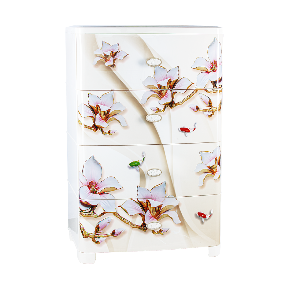 Большой комод с красивым рисунком состоит из четырёх выдвижных ящиков. Благодаря большой глубине и ширине ящиков комод способен вместить большое количество вещей.