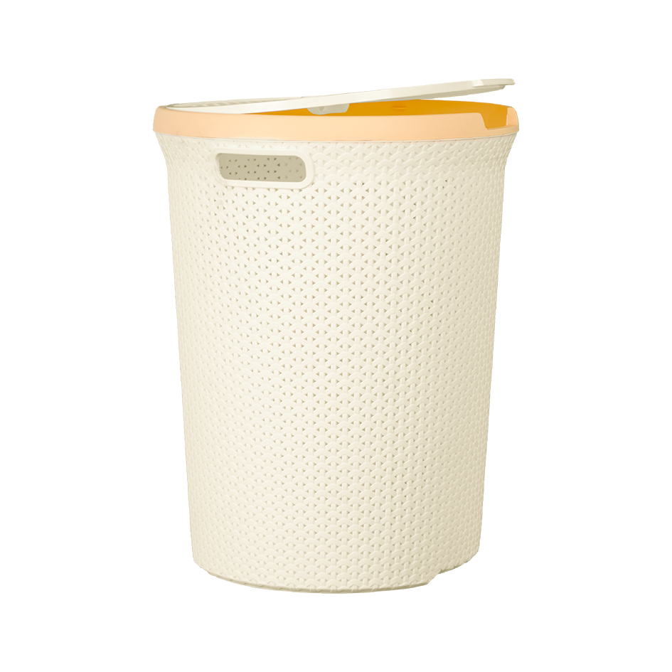 Круглая корзина для белья с крышкой с рисунком в виде плетения. Есть отверстия для рук, благодаря которым удобно брать корзину.