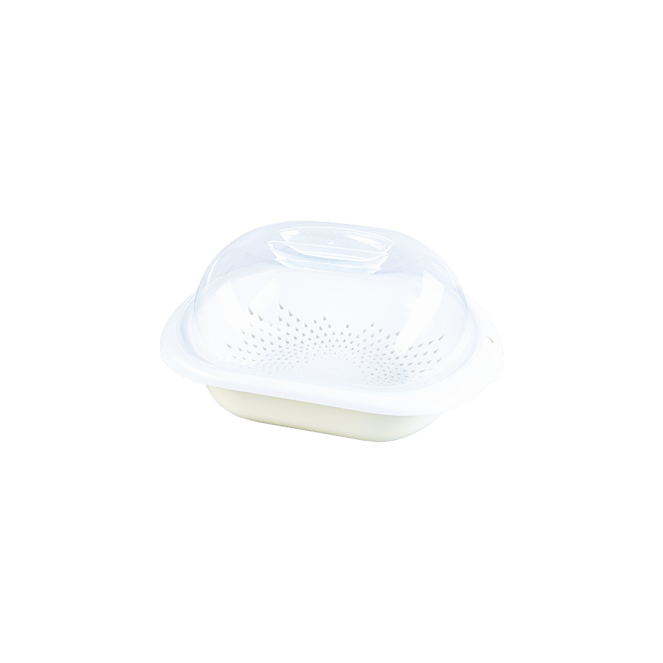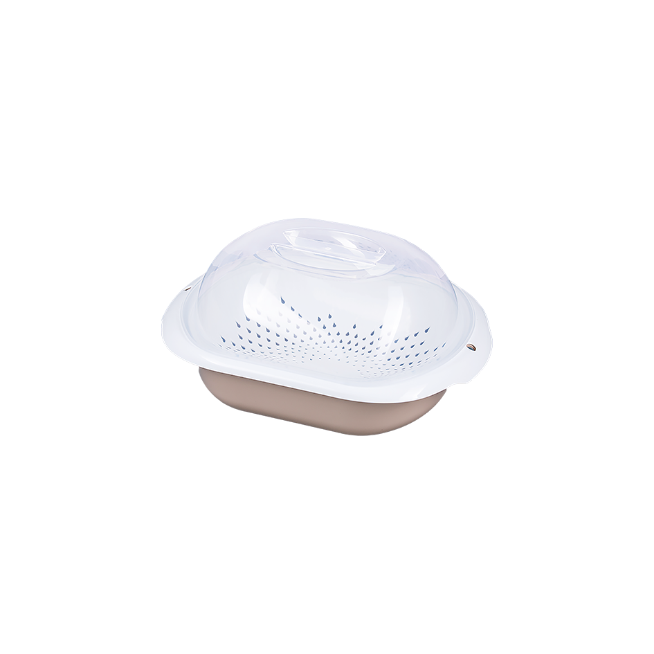 Изделие состоит из трёх частей: миски-основания, миски с дырочками и крышки.