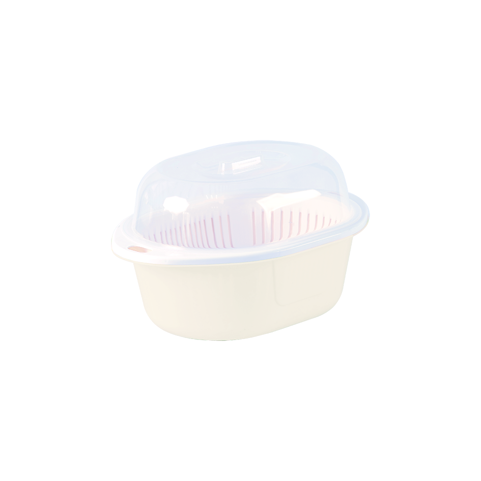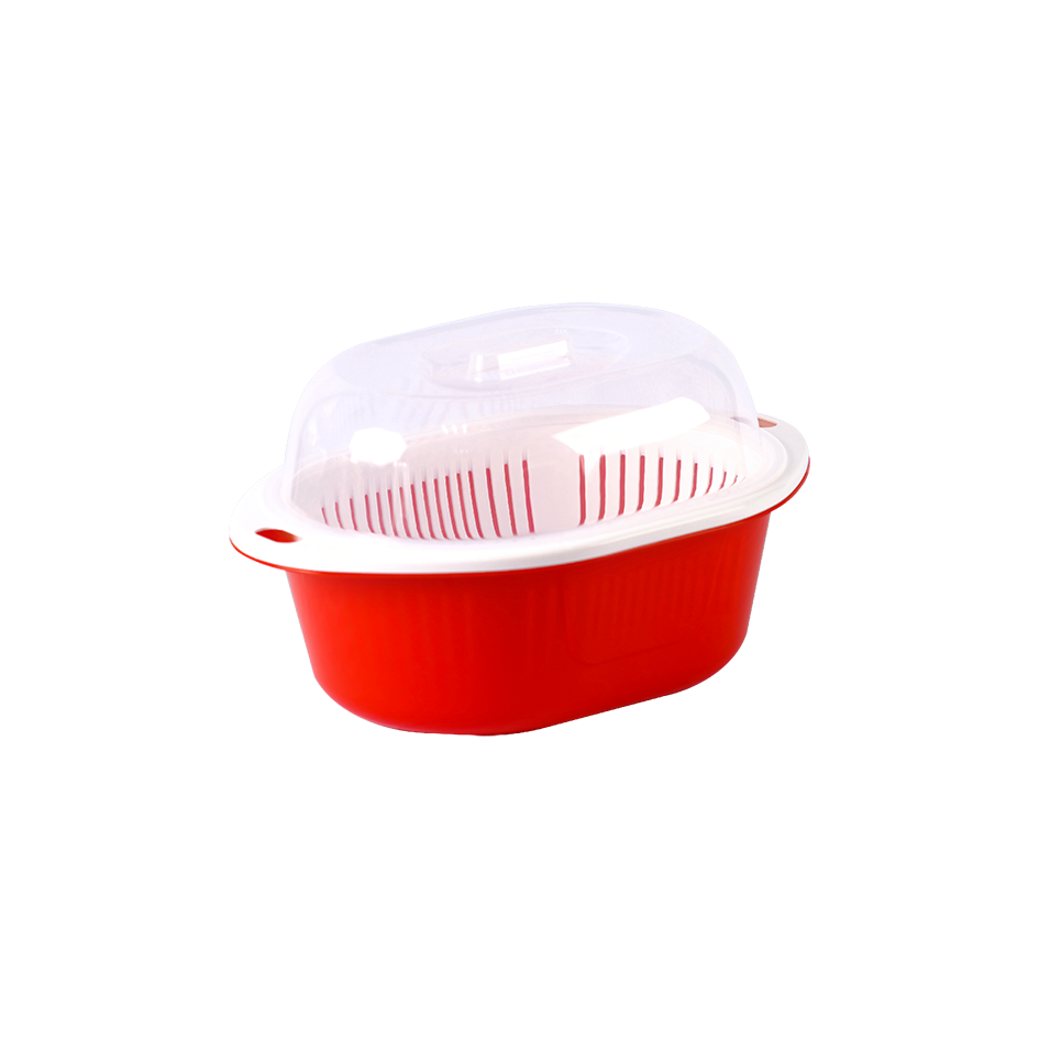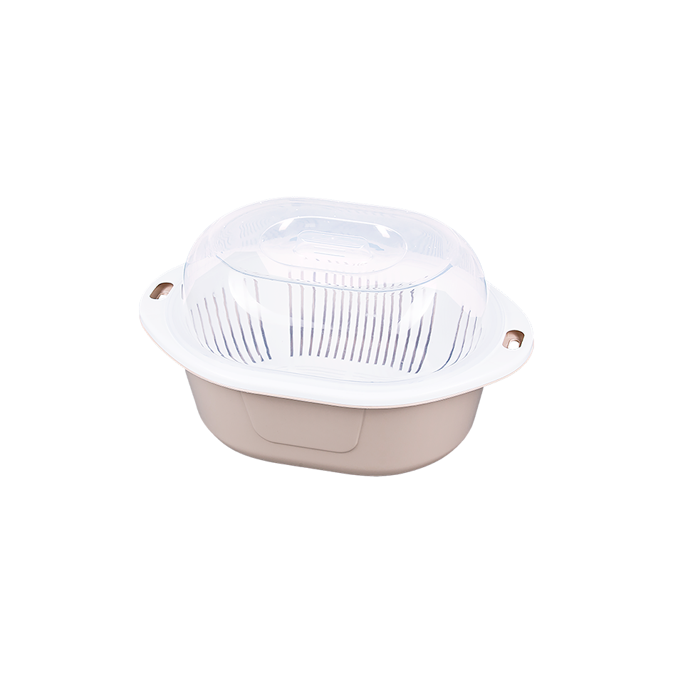 Изделие состоит из трёх частей: миски-основания, миски с дырочками и крышки.